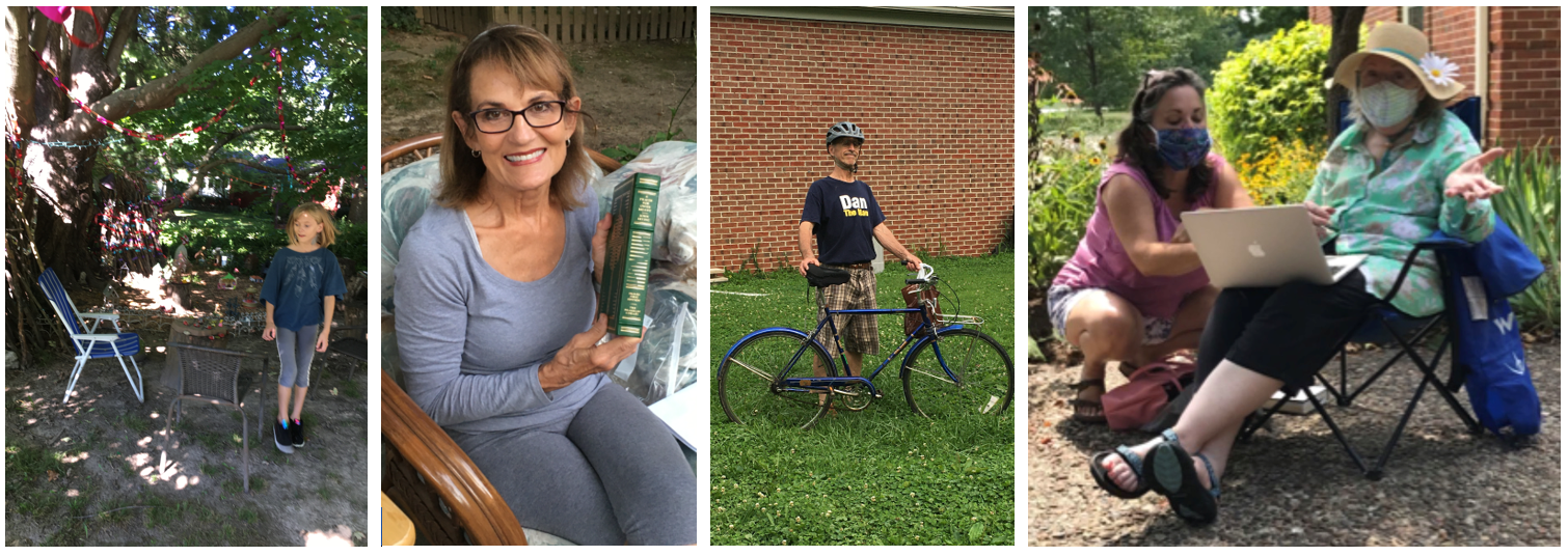 This week, we have (left to right above): LeeAnn exploring a fairy garden. Susan showing one of Dan’s favorite books, A Prayer for Owen Meany, to the “socially distanced” Fun Quakers gathering. She also shared some of Dan’s thoughts about it. Dan the Man striking a manly pose and wearing a manly countenance. Kathy teaching Nancy how to host Zoom!